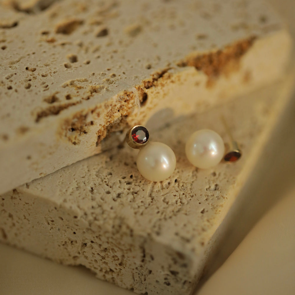 To elevate the allure, each earring features a sparkling Aqua Zircon gemstone in Garnet color. The vibrant gemstone complements the pearls beautifully, creating a harmonious balance between sophistication and a touch of glamour.