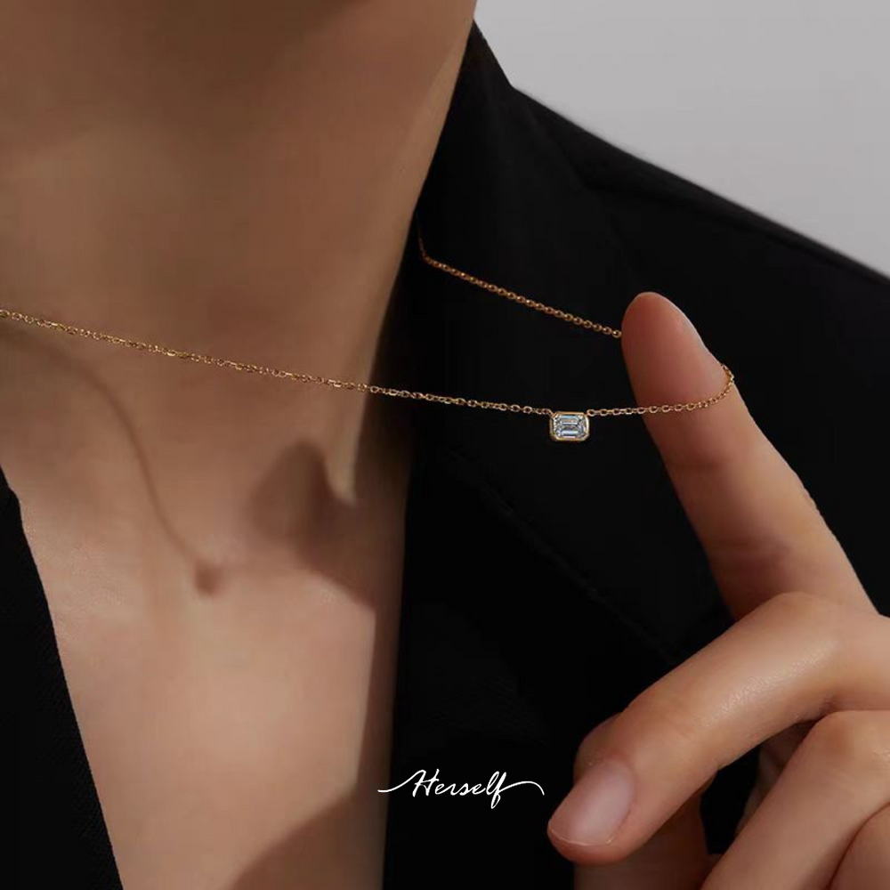 The Simulated Diamond Necklace in emerald cut features a 1ct - 1.5ct (the cutting thickness of each stone may vary slightly, causing a slight difference in carat weight) simulated diamond set in luxurious sterling silver, radiating elegance and modern sophistication. Available in platinum, rose gold, and yellow gold plating, the necklace offers an adjustable chain with a maximum length of 45CM, ensuring a perfect fit for any neckline. This piece is a timeless accessory that can be worn alone or layered.